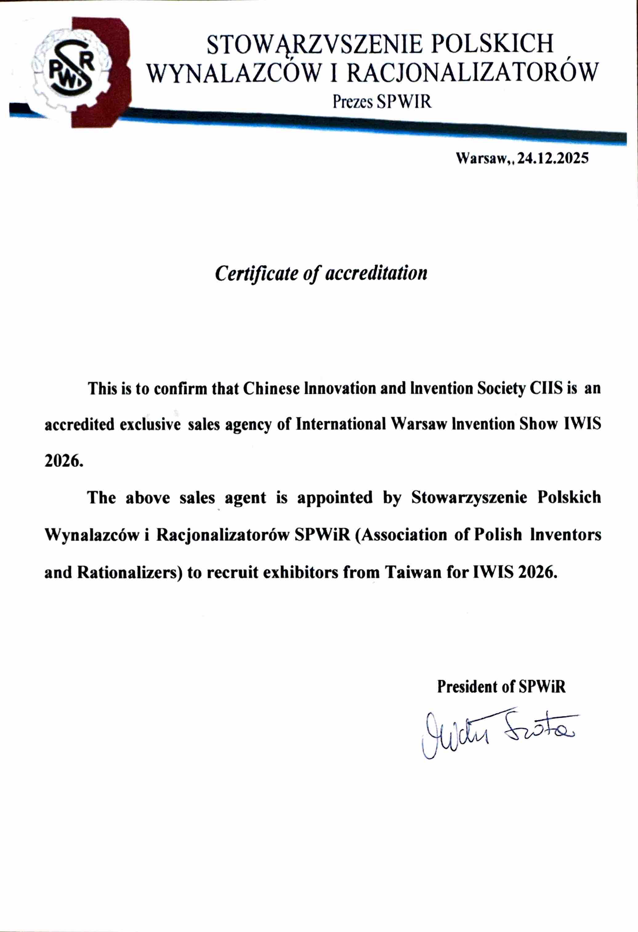 波蘭國際發明展為波蘭規模最大、最具影響力的國際創新與發明盛會之一,同時亦是歐洲指標性的國際大型活動。本展覽由波蘭科學教育部及波蘭專利局共同支持舉辦,長期致力於促進全球創新技術交流,具備高度國際聲譽與專業地位,為國際間極具代表性之重要發明展會。特此敬邀各界發明先進、創新團隊及相關單位踴躍參與,共襄盛舉,拓展國際視野,展現創新實力。本會為IWIS波蘭國際發明展於台灣唯一授權辦理學會,獨家授權代理證書如附件。
